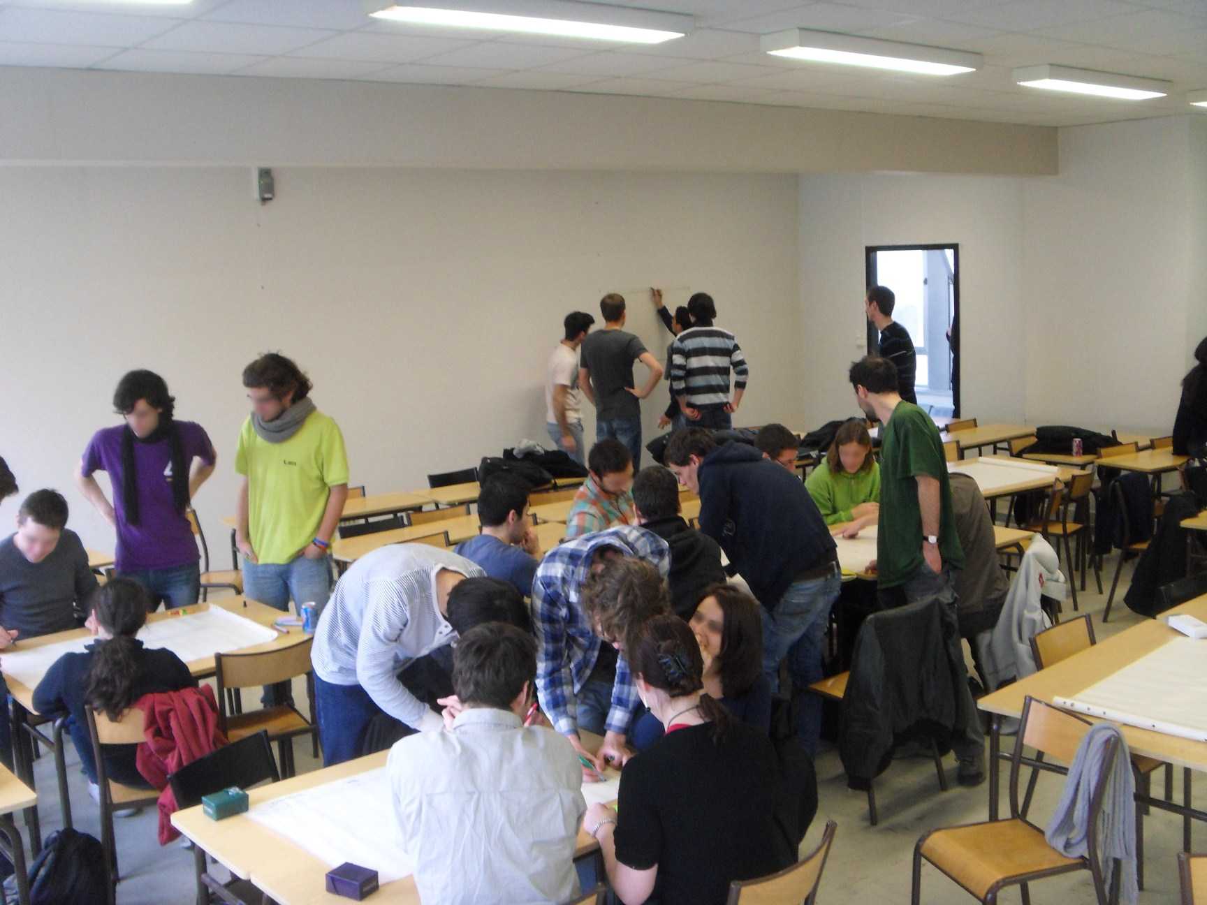 Il faut organiser la communication : une fois les idées exprimées, elles peuvent être discutées en petit groupe, et restituées par le petit groupe aux autres équipes. Les deux sont intéressants : la discussion en petit groupe est plus facile, mais la restitution permet de faire bénéficier de l’expérience aux autres équipes, et force à faire une synthèse des idées.