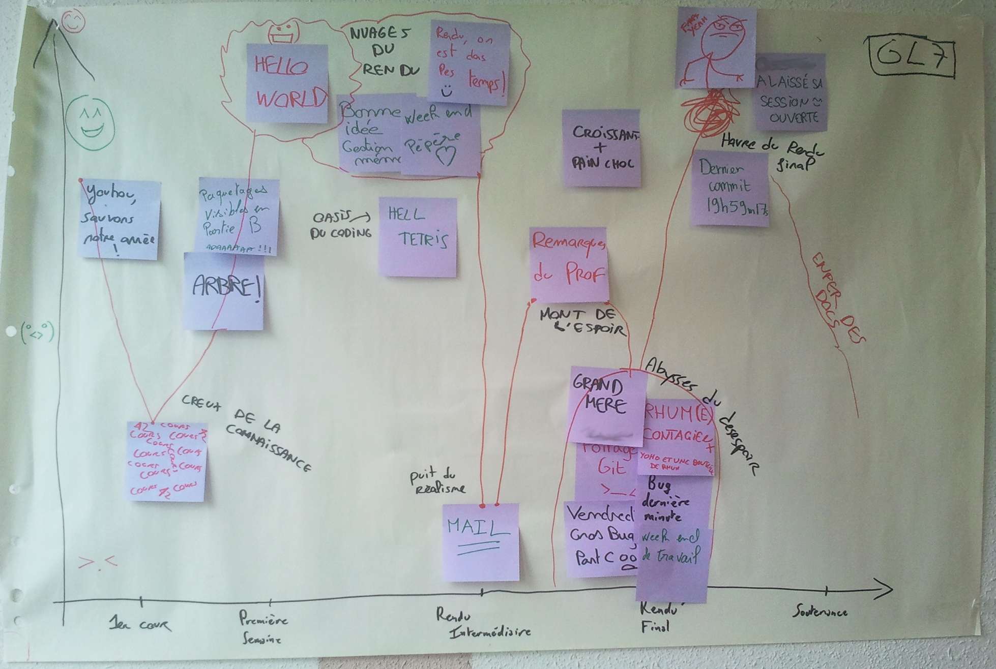 Chaque équipe discute en privé des idées notées ci-dessus, place les post-its sur la feuille, et peut tracer une (ou plusieurs) courbe d’évolution du moral de l’équipe au fil du projet.