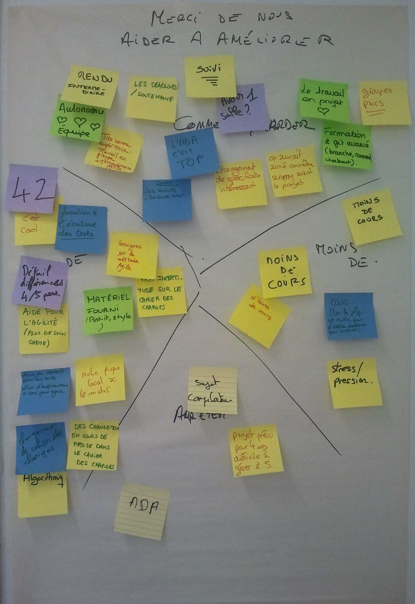 Une feuille commune à toutes les équipes est accrochée près de la sortie. En partant, chacun peut ajouter un post-it dans une des cases :