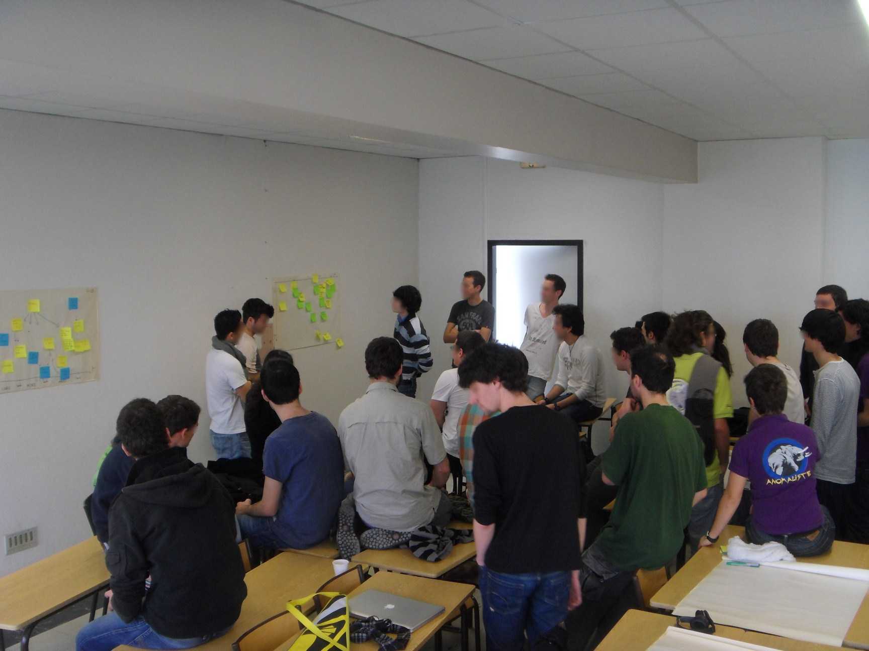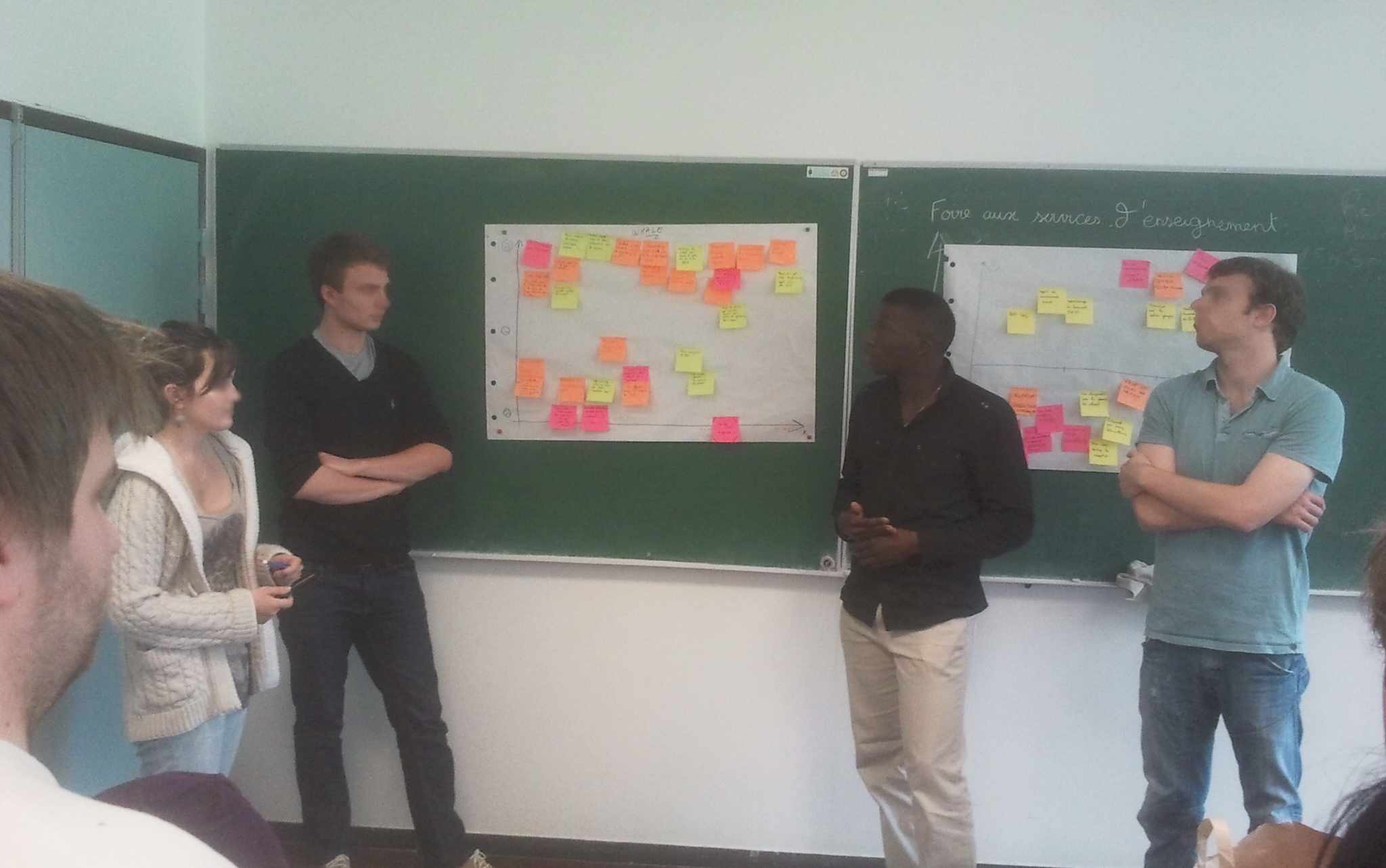 On accroche les feuilles de paper-board au mur pour que tout le monde puisse voir. Tour à tour, chaque équipe se sert de sa feuille pour raconter son projet aux autres.